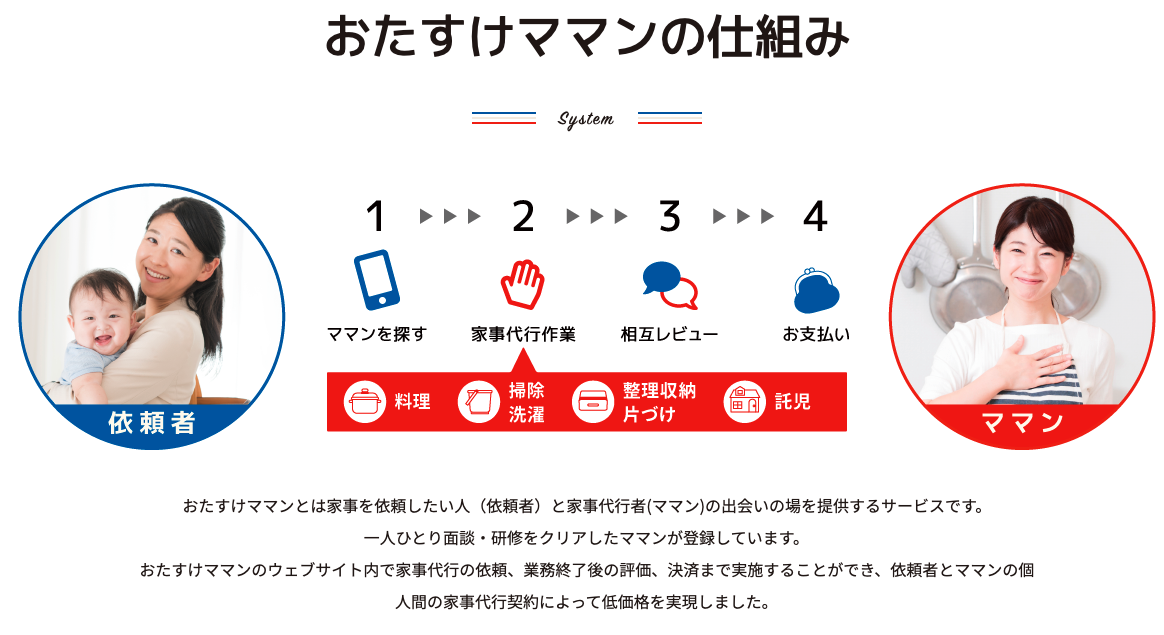 家事を依頼したい人が自分でネットでママンを探して、家事を依頼し、決済までできるサービスです。