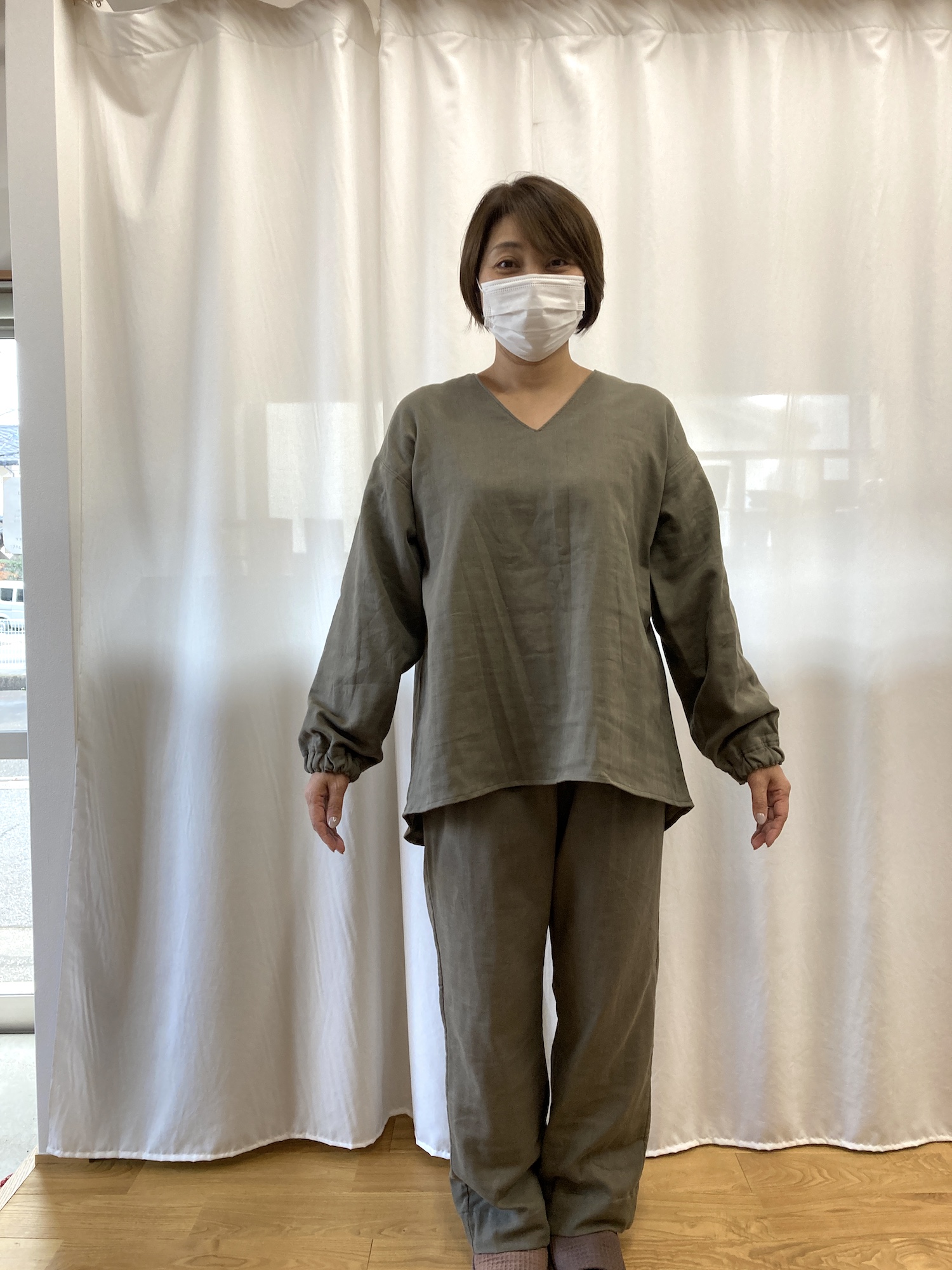 急な宅配便がきても大丈夫。おしゃれなルームウェアのような色味です。この色はカーキ。他には、スモークピンク、スモークラベンダーのような紫の3色展開を予定。