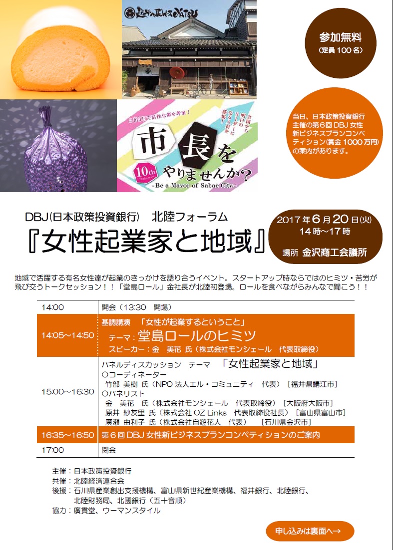 日常のこと 北陸の起業女子必見!「女性起業家と地域」DBJ主催 北陸フォーラム 地域で活躍する女性起業家のトークセッションイベントが開催されます。登壇される起業家の方々は有名な方ばかりで、北陸ではなかなか珍しいイベントですよ。あの堂島ロールの株式会社モンシェール社長をはじめ、富山からは株式会社OZ Links代表取締役... 2017.05.25 日常のこと