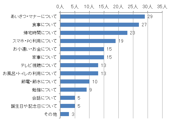 最も多いのは「あいさつ・マナーについて」29人(29%)、次いで「食事について」27%、3位が「帰宅時間について」23%。フリー回答には「食事中は学校であったことを話す」「夕飯のメニューのリクエストは午後2時締切。リクエストがない場合、おかずに文句は言わない」などの声がありました。