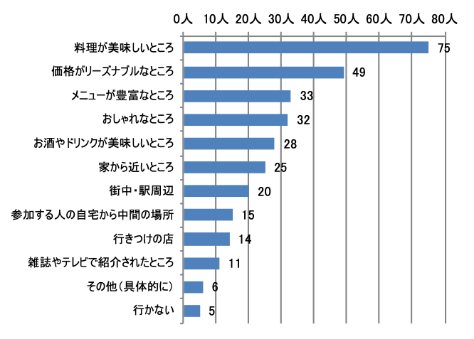 最も多いのが「料理が美味しいところ」75人(77%)、次いで「価格がリーズナブルなところ」49人(50%)、3位が「メニューが豊富なところ」34人(34%)。「その他」として「会社の指定したところ」「小さい子連れでも問題ないところ」「友人が経営している店」「ネットの評価の高い店」「幹事さんに決めてもらったお店」との回答がありました。